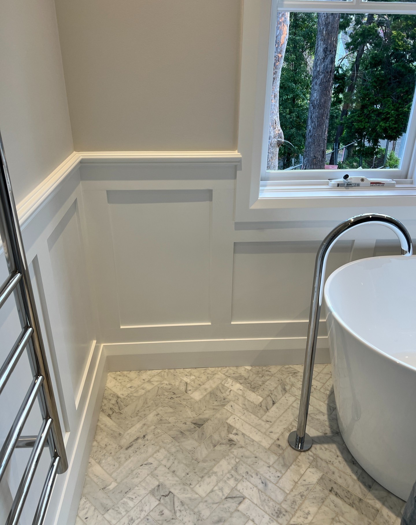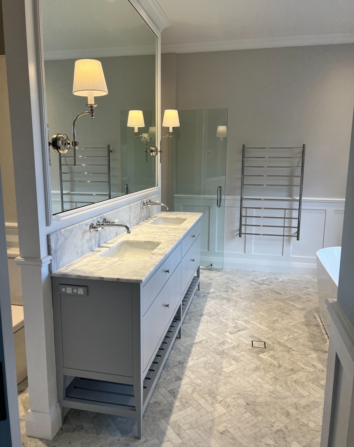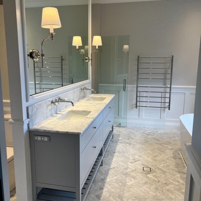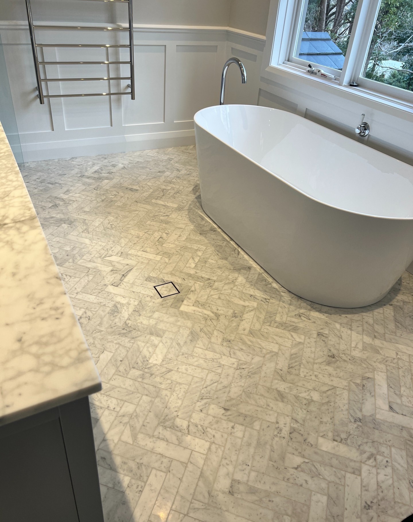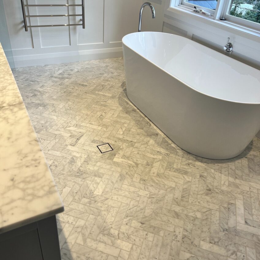 Bianco Carrara marble mosaics are stocked in large and small size herringbone pattern.