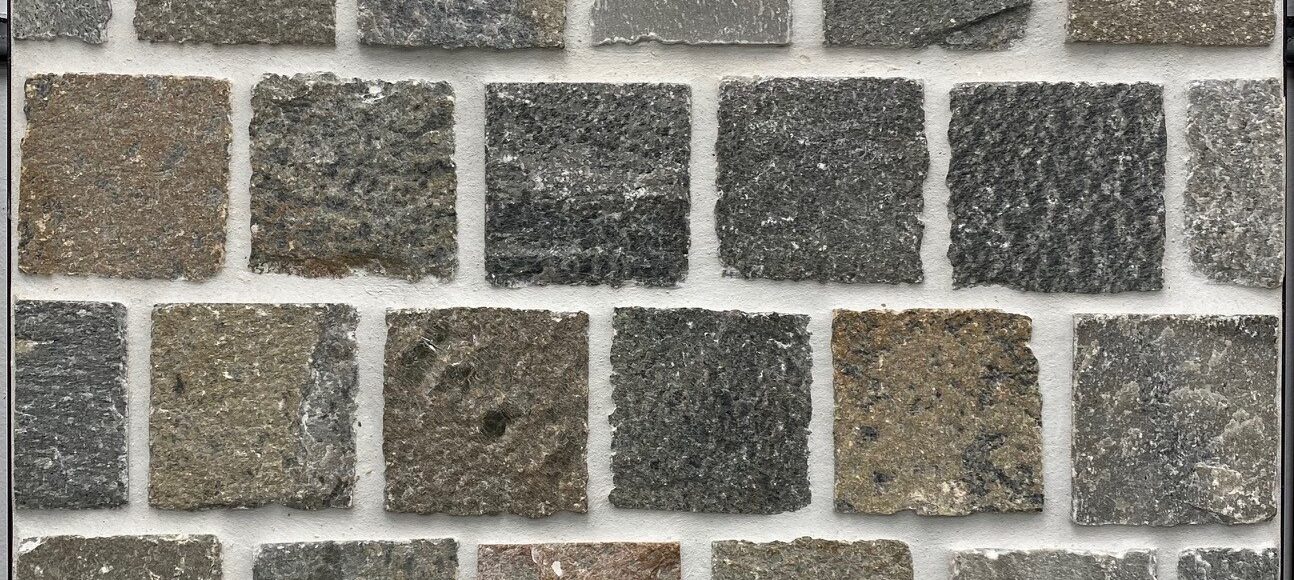 Positano Quartz Cobblestone. A cobblestone blend featuring earthy brown tones interwoven with muted greens, charcoal, and soft greys creates a naturally weathered, organic look. The varied colors mimic the gentle aging of stone in outdoor landscapes, giving the surface a rich, textured character. Its subtle shifts in hue make it both visually interesting and effortlessly timeless. Sheeted and set in an offset pattern.